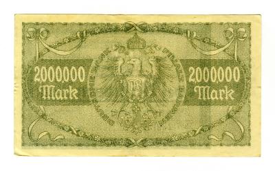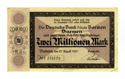 Gutschein über 2 Millionen Mark der Deutsche Bank Filiale Barmen, ausgestellt am 25.8.1923 in Barmen. Querrechteckig, 9,8cm