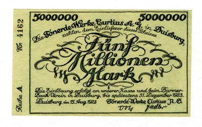 Notgeldschein über 5 Million Mark der Tonerde Werke Curtius A.G., ausgestellt am 15.8.1923 in Duisburg. Querrechteckig, 8,7cm x 14,8cm. Schwarz verziert.