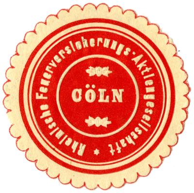 Die runde Marke mit weißer abgerundeter Zahnung zeigt weiße geprägte Schrift auf rotem Grund: "Rheinische Feuerversicherungs-Aktiengesellschaft,
