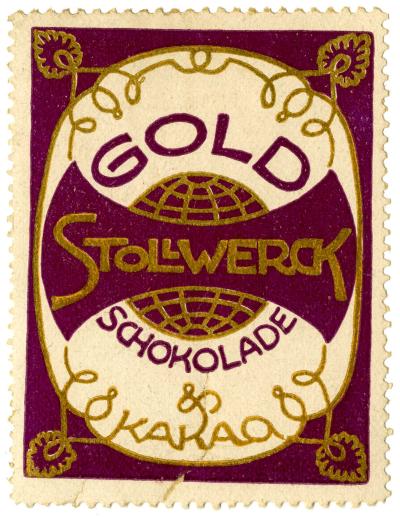 und goldener Schrift:"Gold, Schokolade, &, Kakao". 1839 eröffnete Franz Stollwerck (1815-1876) in Köln ein Werk zur Hustenbonbon-Produktion,